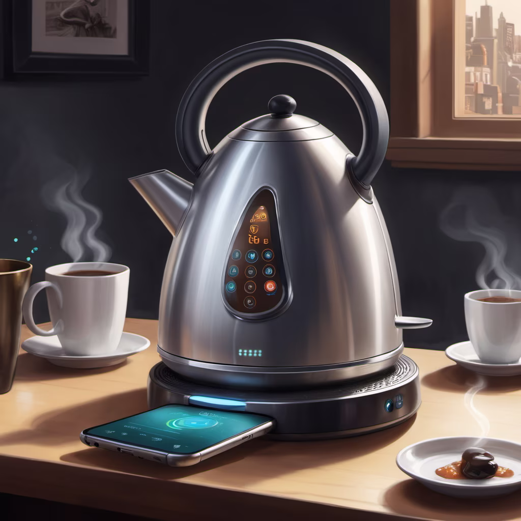 Prompt: a finny image of a smart kettle getting orders from a cellphone via wifi, intricate details