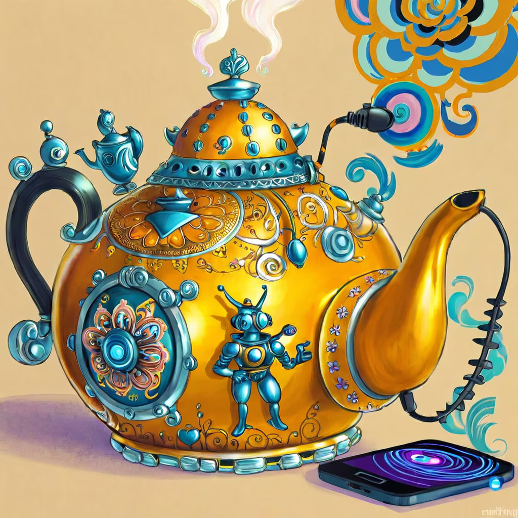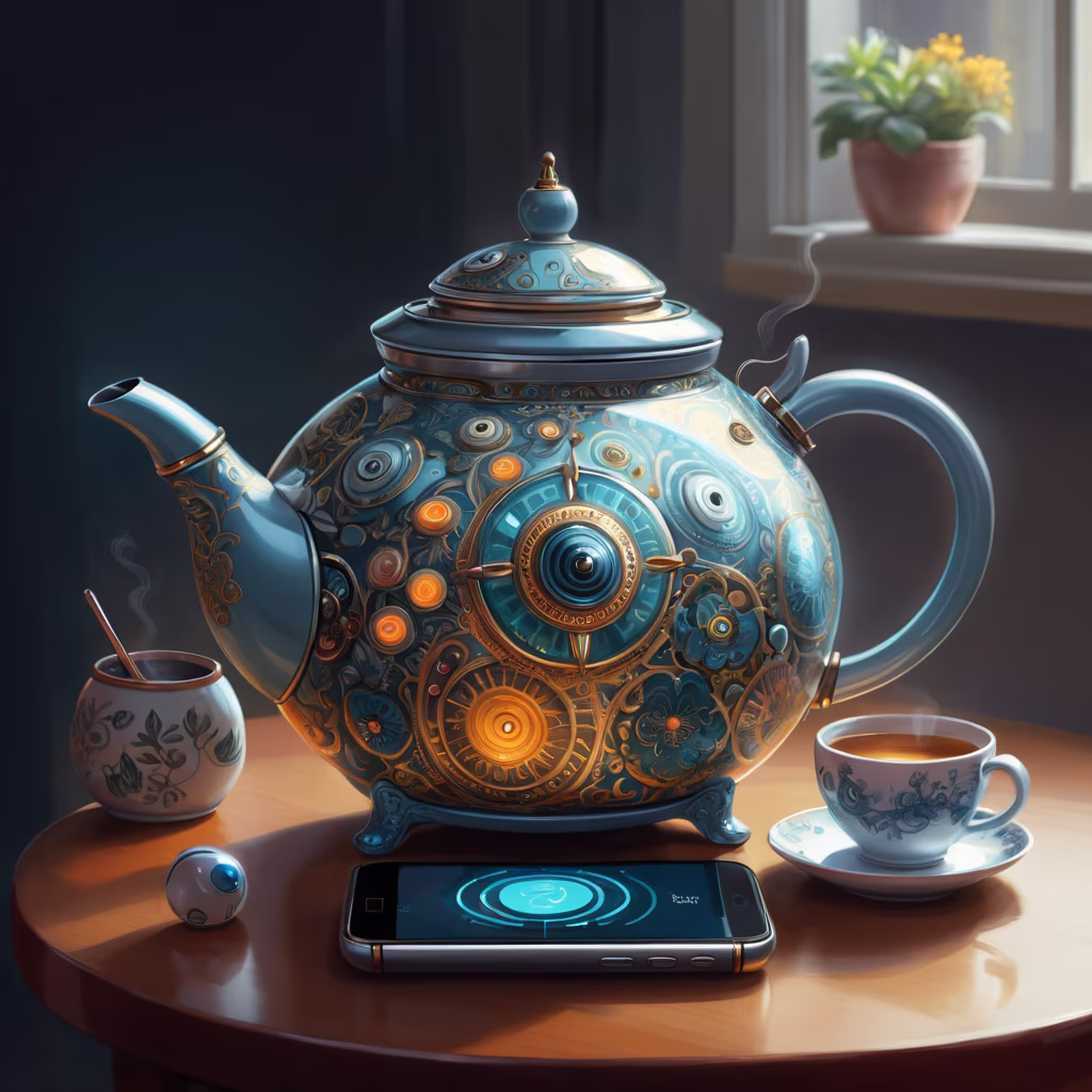 Prompt: an image of a smart teapot talking to the cellphone via wifi, intricate details