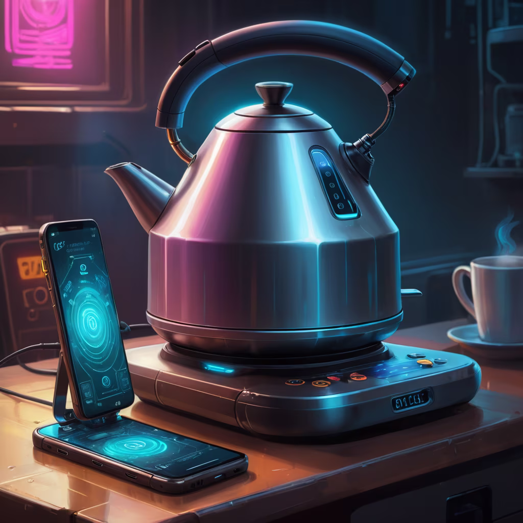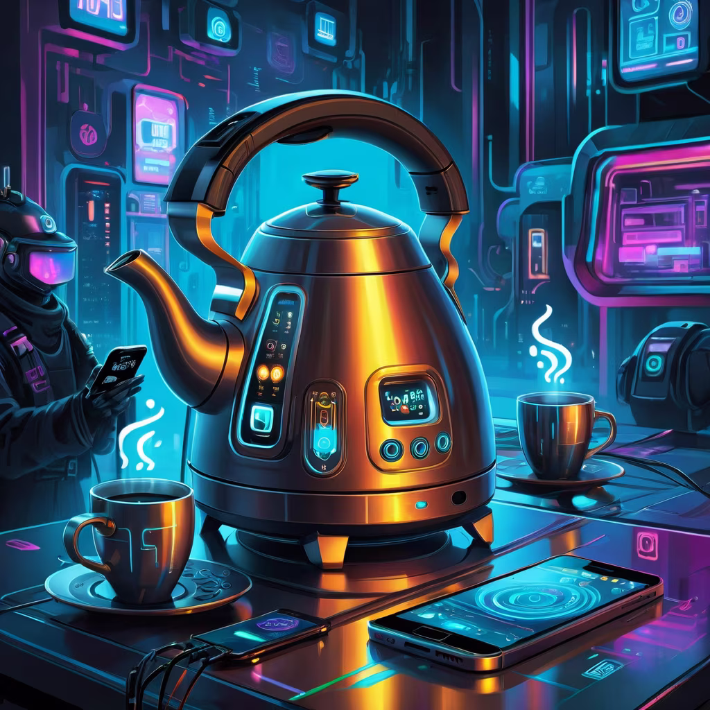 Prompt: an image of a smart kettle getting orders from a cellphone via wifi, cyber punk, intricate details