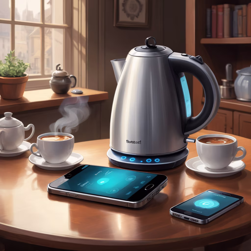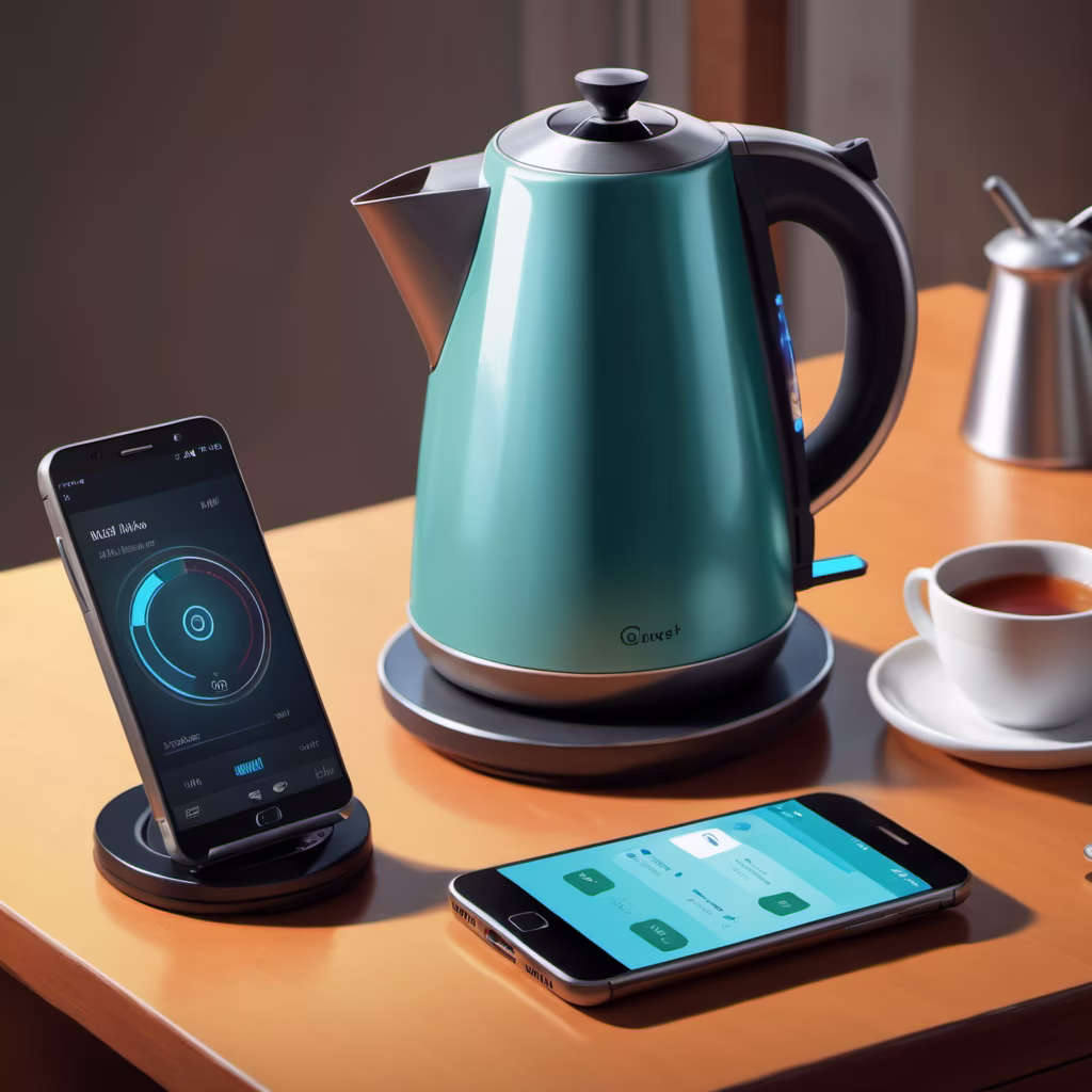 Prompt: an image of a smart kettle getting orders from the cellphone via wifi, intricate details