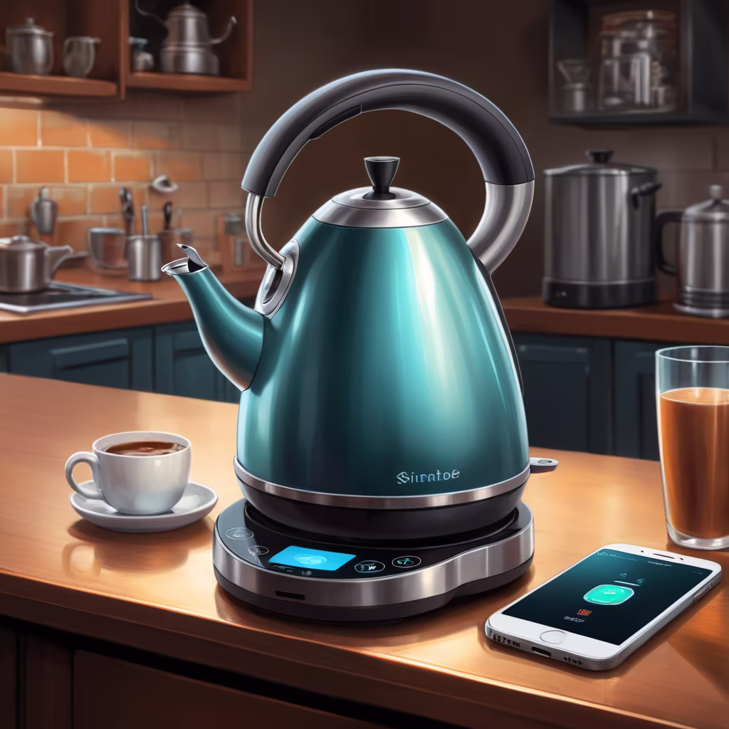 Prompt: an image of a smart kettle getting orders from a cellphone via wifi, intricate details