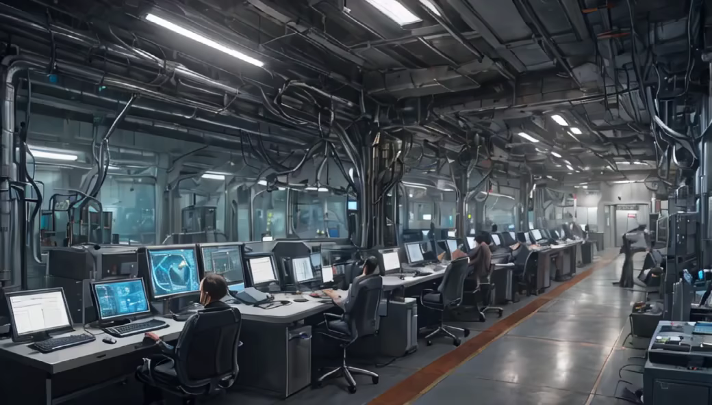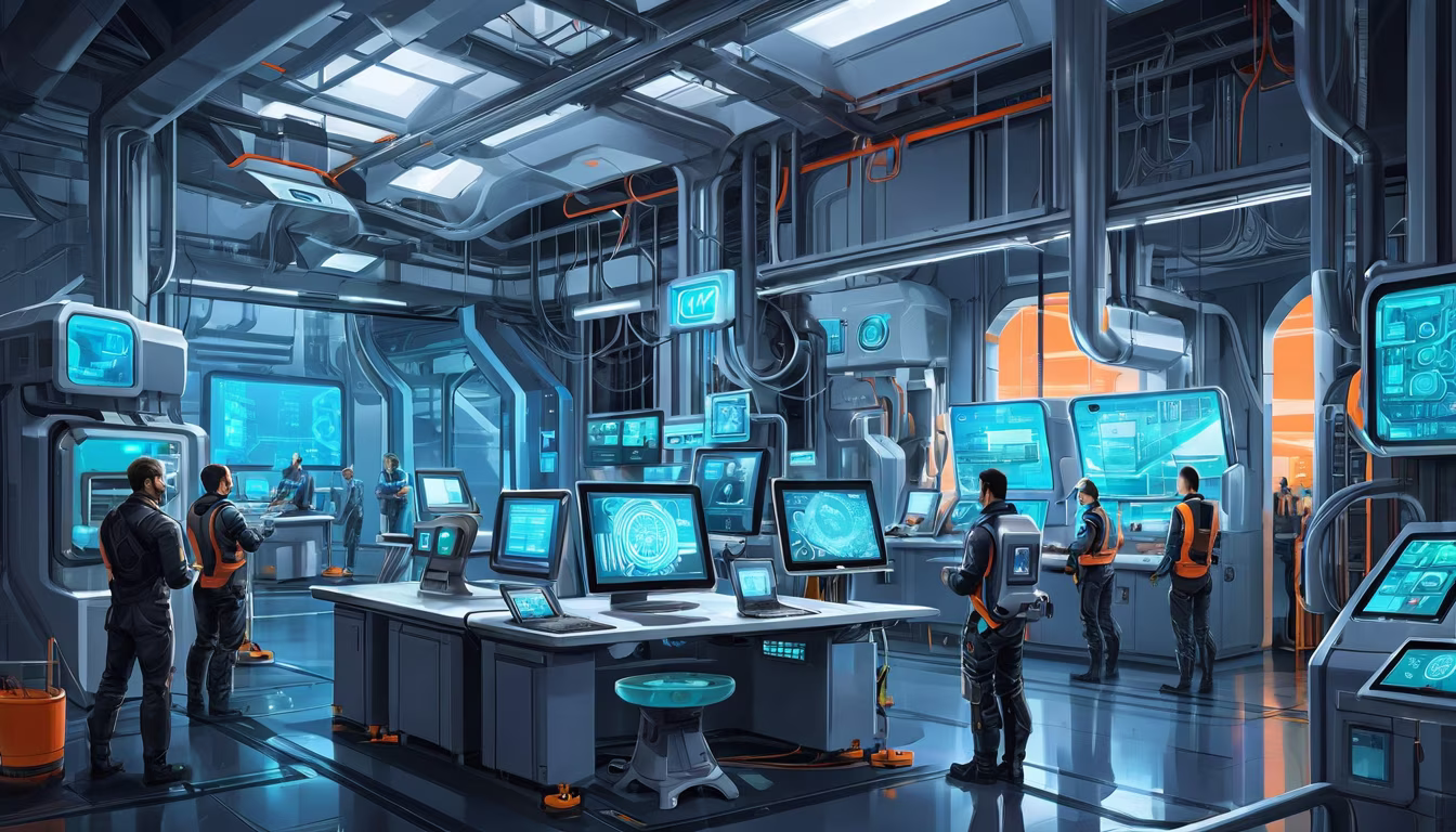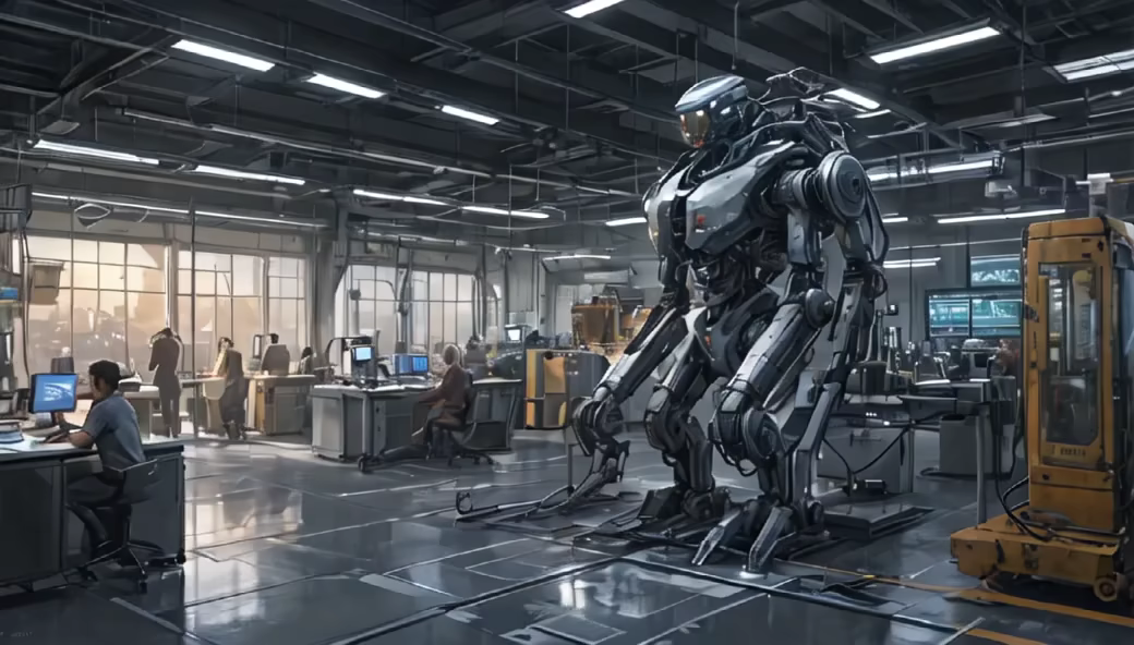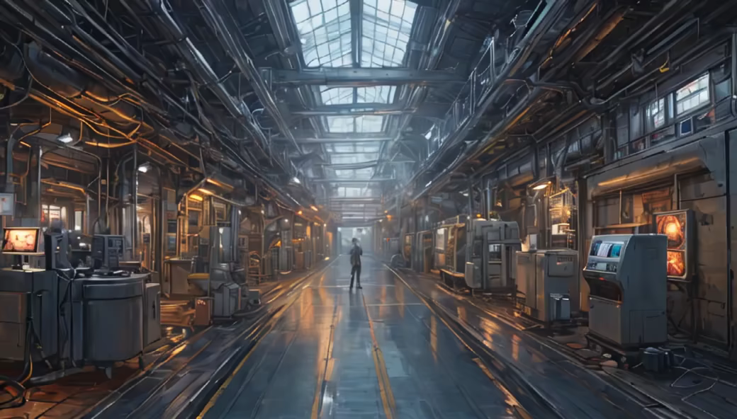 Prompt: AI takeover in a futuristic IoT factory