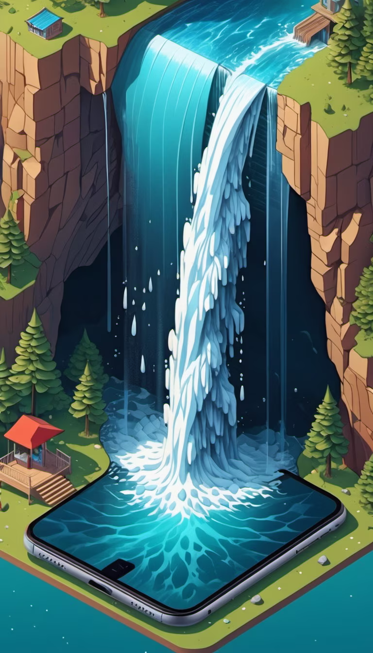 Prompt: Surreal, a waterfall flowing inside the phone,(masterpiece,top quality,beautiful details),8K,
