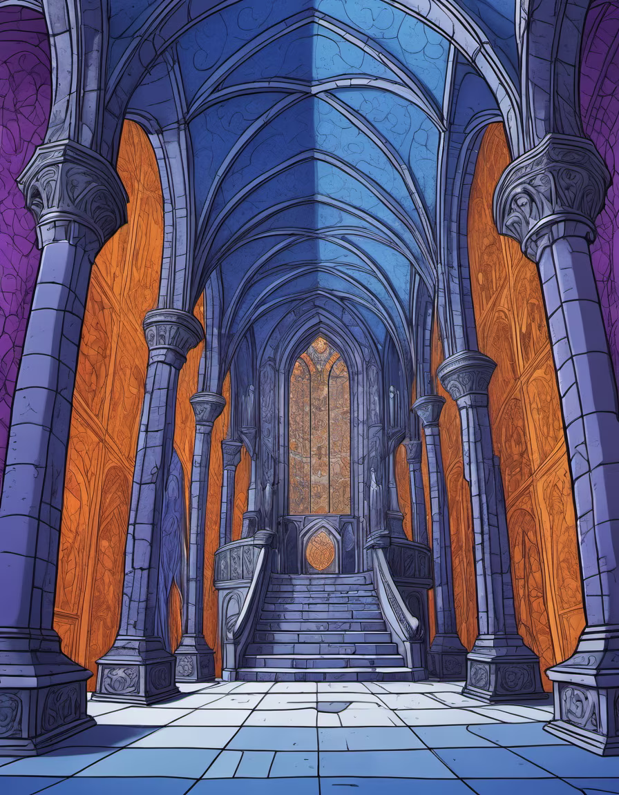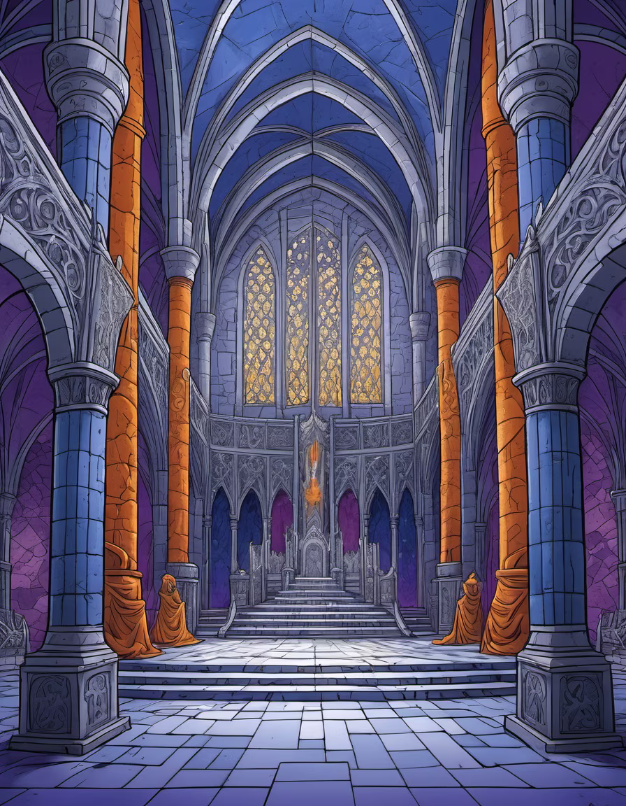 Prompt: Panoramic view of huge medieval throne room, beautiful dream medieval world, silvery, blue, purple, yellowish, indigo, orange glares, fantasy lineart style