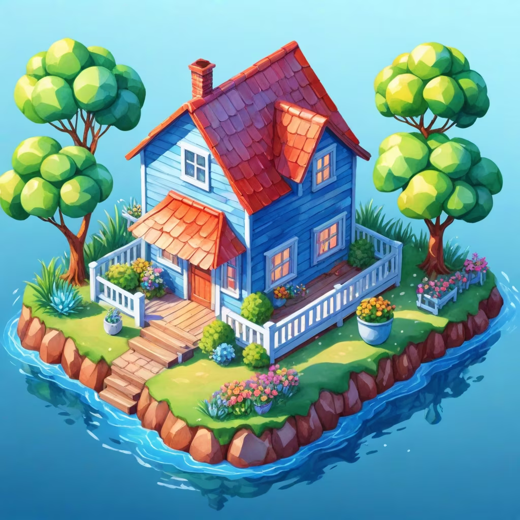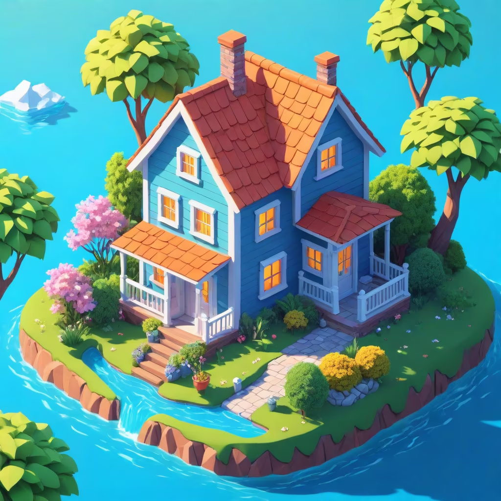 Prompt: there is a painting of a small house on a small island, cute detailed digital art, cottage town, isometric 3d fantasy cute house, 8k high quality detailed art, detailed painting 4 k, stylized 3d render, house background, 3 d render stylized, detailed 2d illustration, 4k detailed digital art, super detailed color lowpoly art
