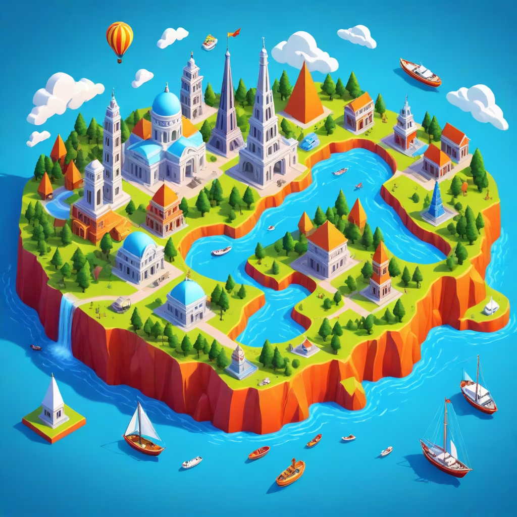 Prompt: 3D isometric :: colourful realistic world map, famous landmarks for learning game, Aerial view shot