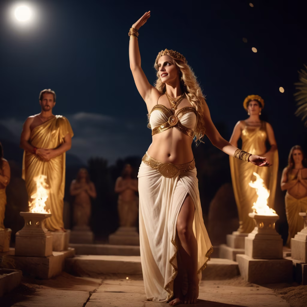 Prompt: goddess aphrodite dancing on graves, bloody feet, dirty feet, wearing a a toga, golden hair, creepy, sexy, belly dancer, hands in the air, midnight, seductive