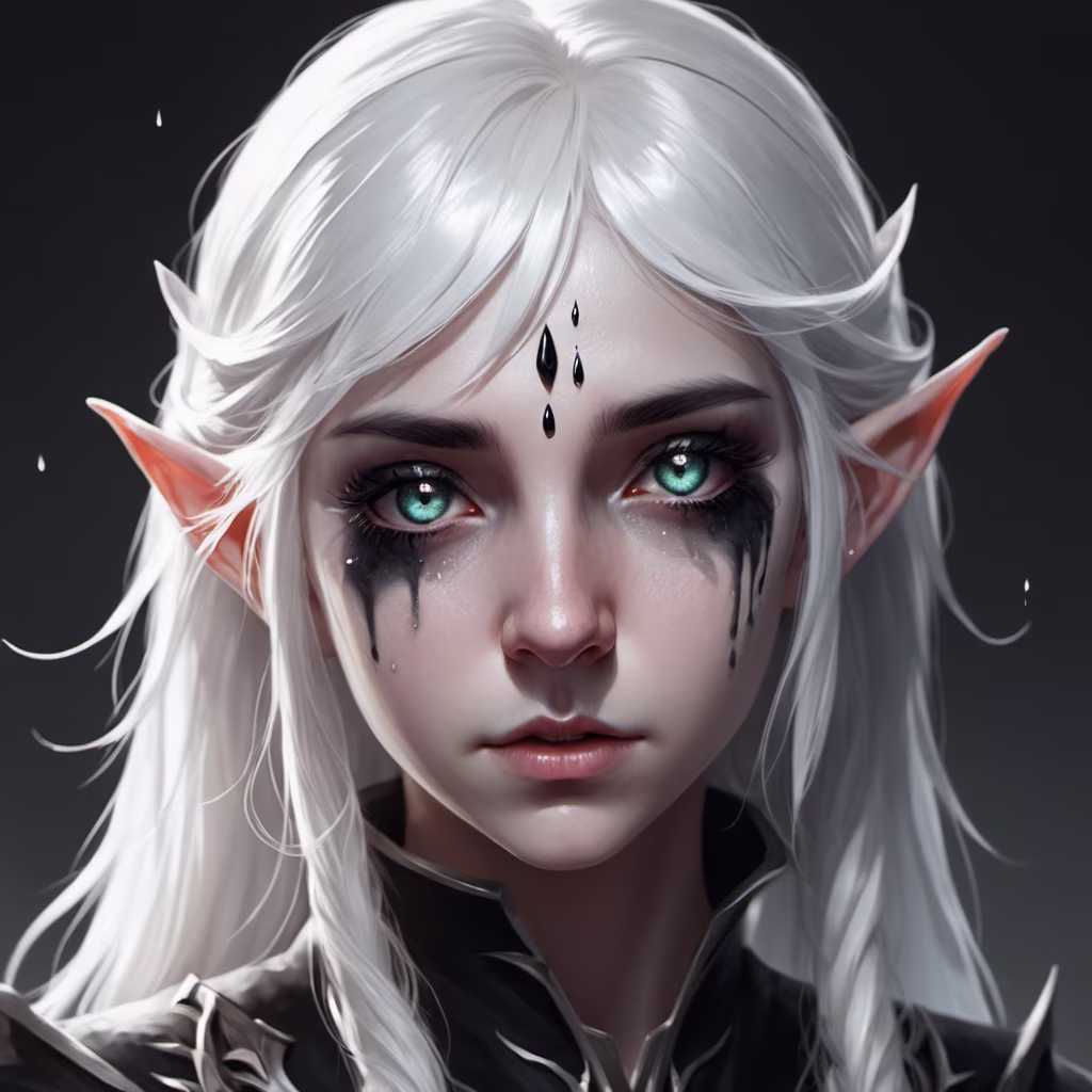 Prompt: black tears dripping from the girl's eyes, fantasy style, dnd character, white hair and elf-like ears but looking down