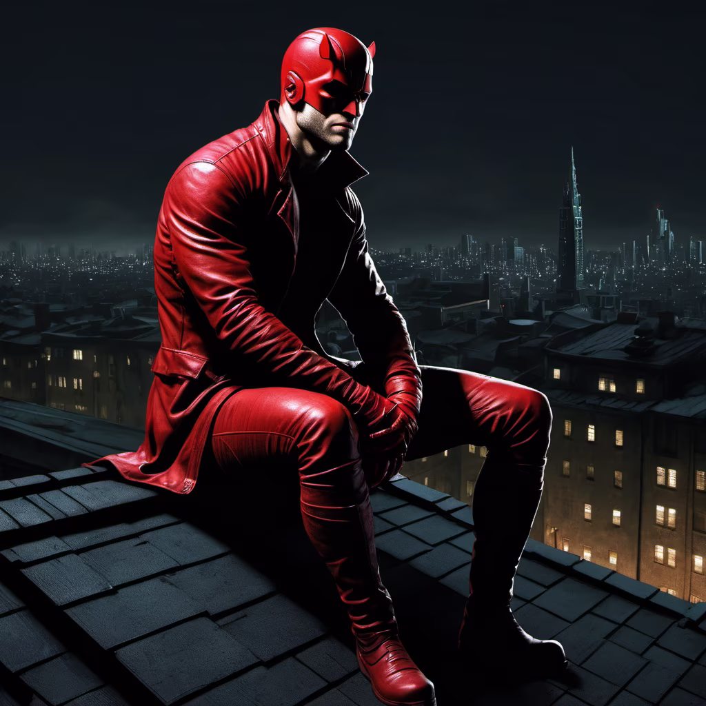 Prompt: daredevil,villain ,sitting on the roof in lost and totally anime dark city ,detailed, stunning graphics by Leonardo da Vinci ,