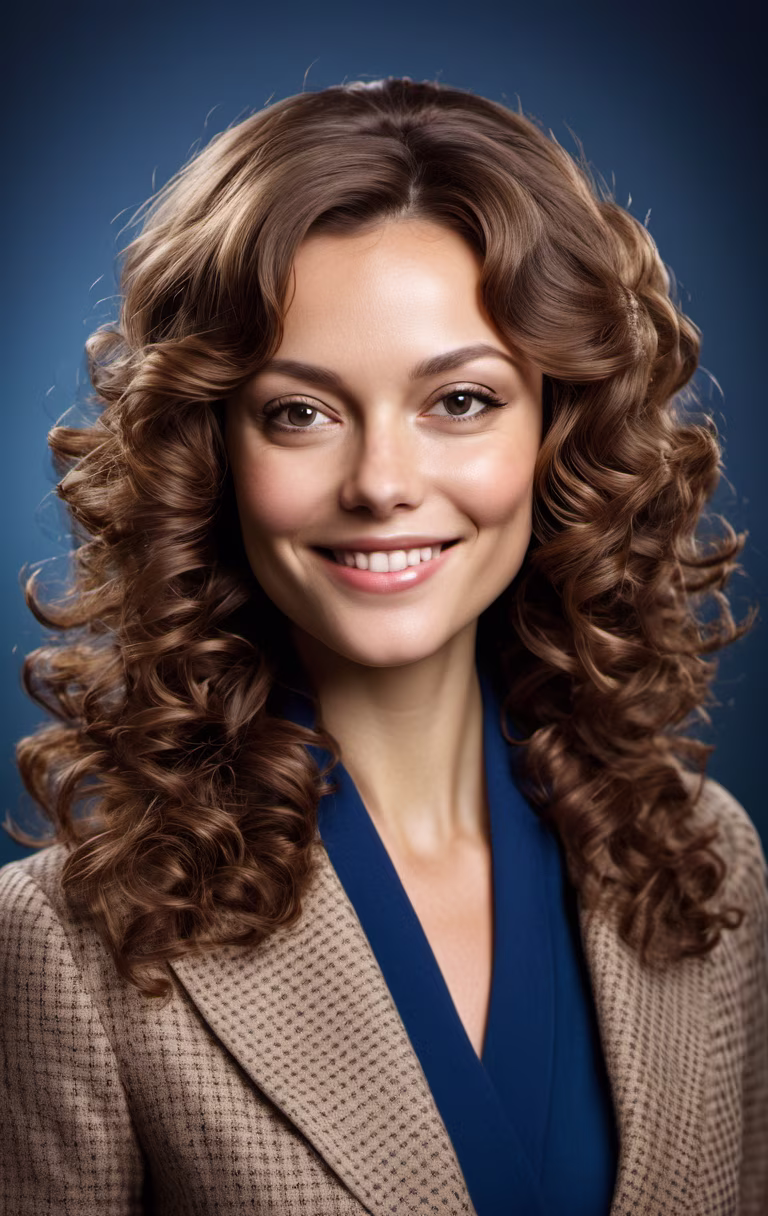 Prompt: Year:1970. Formal studio portrait. High detail, Canon EOS DSLR photograph. UHD, 8K resolution, sharp focus, full color, intricately detailed and extremely close up intimate facial portrait of a stylish, age 35 wife in 1970, showcasing her long, curly, generously and profusely highlighted dark blonde hair. She smiles flirtatiously. Her very thick, luxuriant, richly textured hair almost fills the viewing frame and is delicately arranged in a very uniformly curled, with loose medium sized barrel curls, highly voluminous, long style. She has elegant, sophisticated makeup. Solid, light colored background. Accurate 1970 styling.