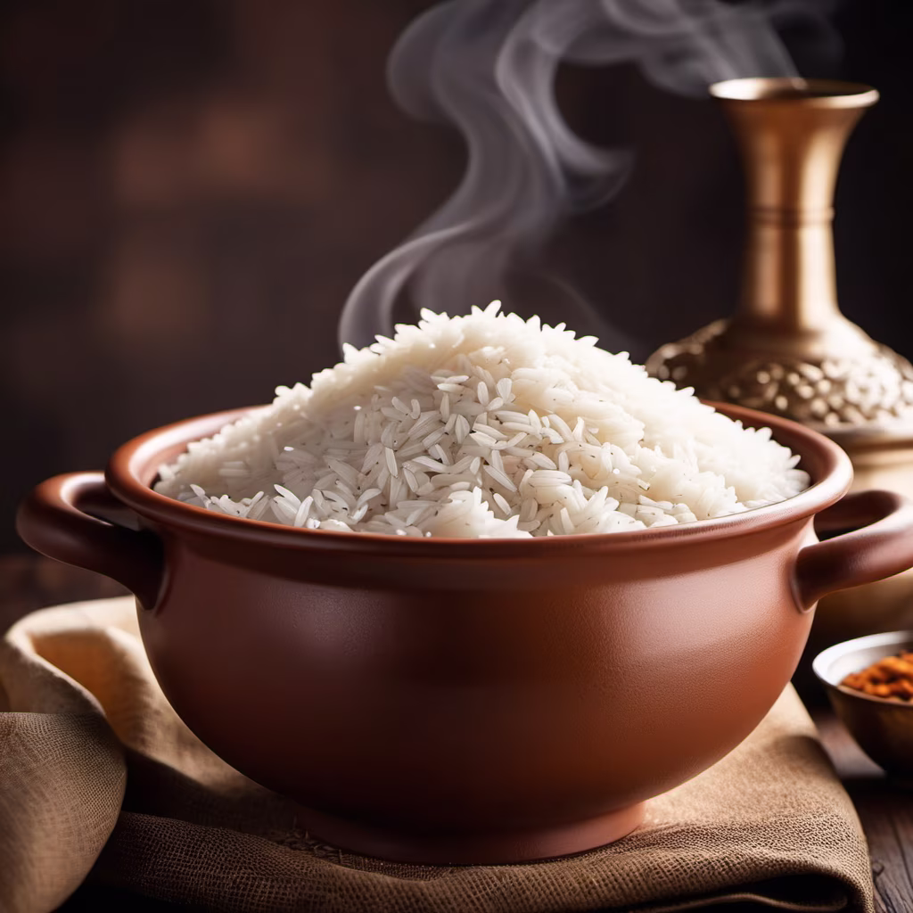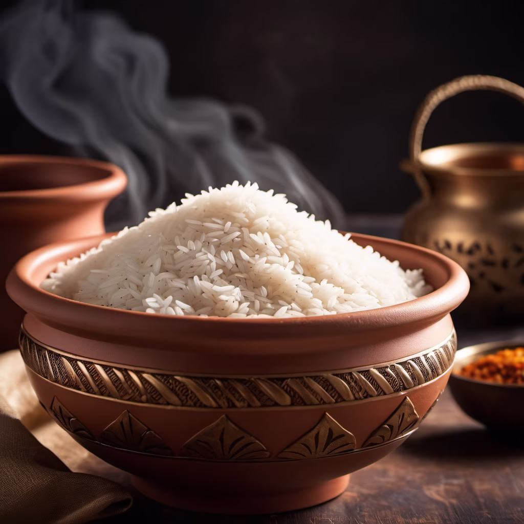 Prompt: a front shot of rice in an Indian pot made out of clay, neutral back ground with no disturbances, realistic and warm tone , steam from white rice inside the pot