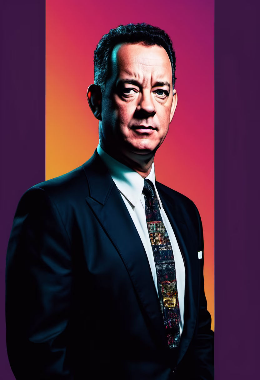Prompt: tom hanks, in the style of album, folio and fan formats, (((bold colorism))), (artist henry rogers:1.2),symmetrical, thriftcore, poster, in the style of hip hop, retrowave, vivid, natural dark lighting, dotted