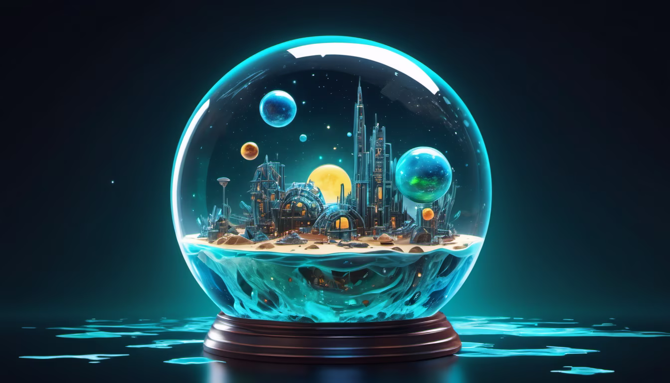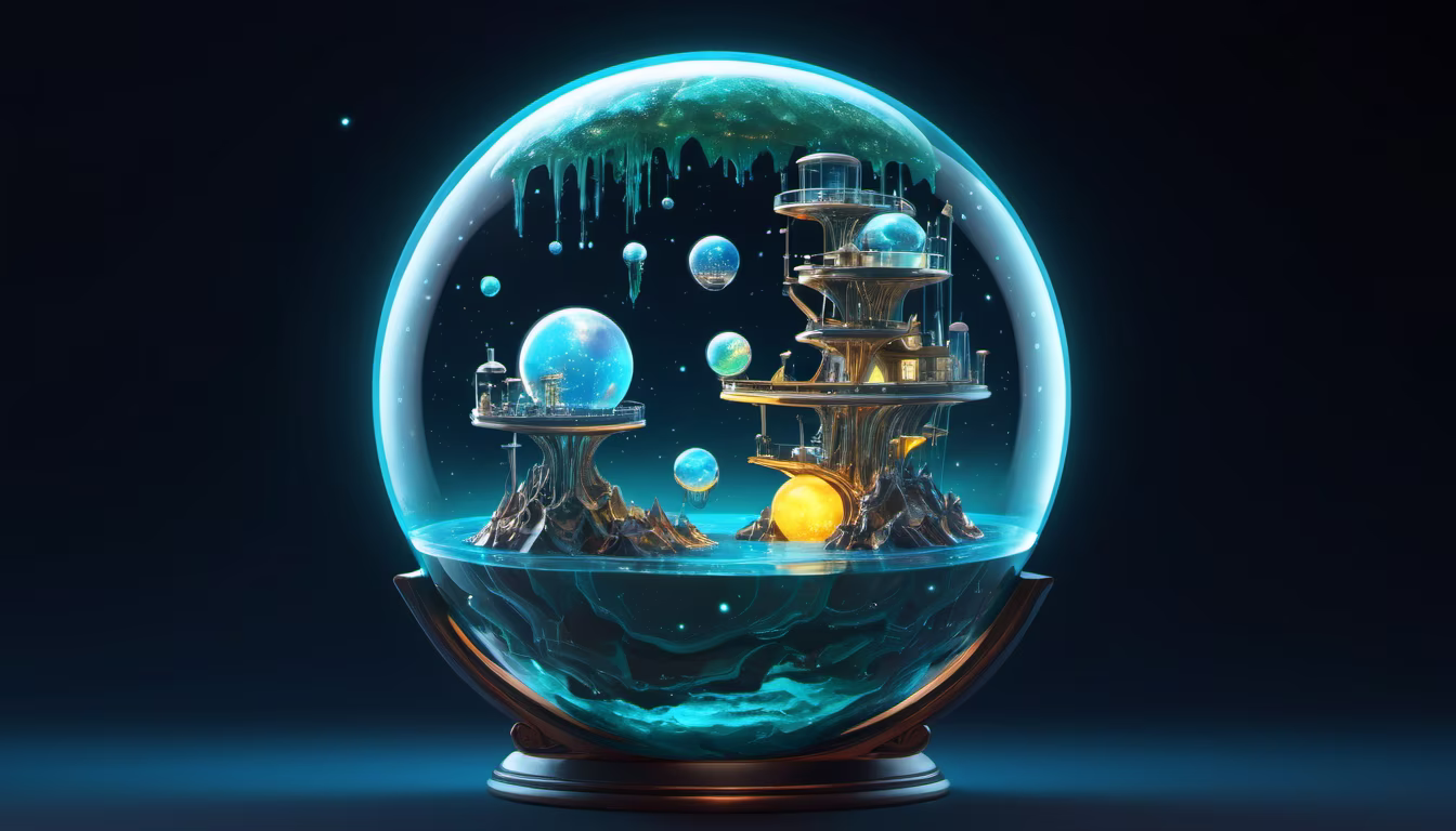 Prompt: space planets, star, moons, surreal universe clear ocean water inside a clear glass globe, unrealistically drawn, amazing new amazing futuristic slime planet of goo ooze with solar panels hd 3d 32k