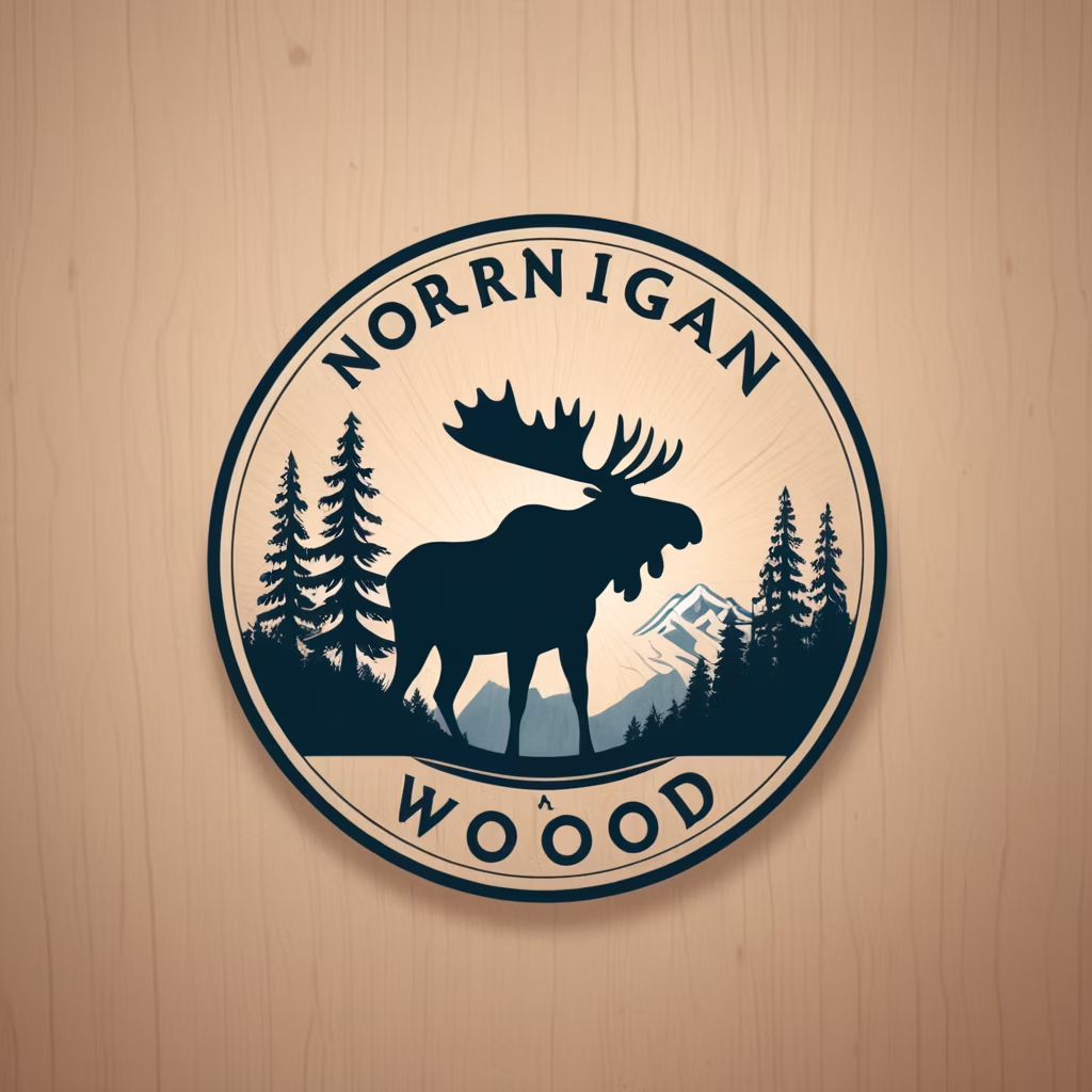 Prompt: An emblem-style logo design for Norwegian wood company. It features a combination of a moose head, a fjord, and pine trees, encapsulating the essence of Norway's natural beauty and the heritage of the wood industry. The design has a classic or vintage feel, with a potential circular or shield-like shape.