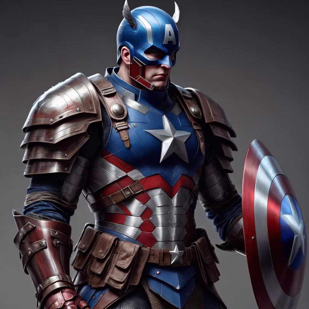 Prompt: Midieval knight full armor captain America ,,(armored)nightcore,by Tom Mumford and Jarek KubickiandAlejandro Aravena
