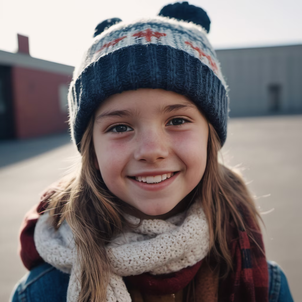 Prompt: a cowboy shot of a young girl with a collection of Beanie, light smile, urban, s0fv3rgara