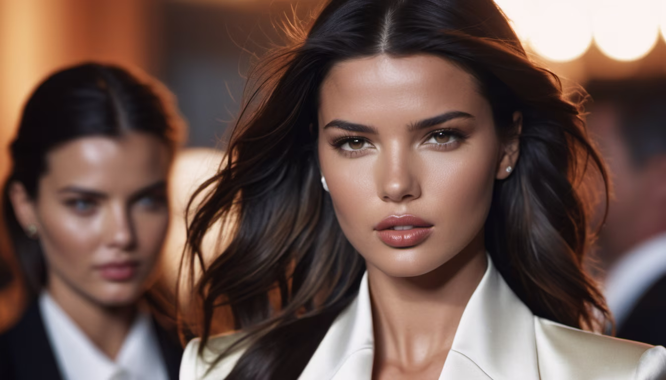 Prompt: close-up, Vintage out of focus photography with motion blur, twisted femme fatale ( mix of young adriana lima, Ana de Armas and Emily Ratajkowski ) ; in silk slit suit body