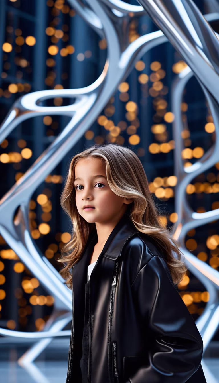 Prompt: Architect zaha hadid , kids version, in front of his most emblematic work