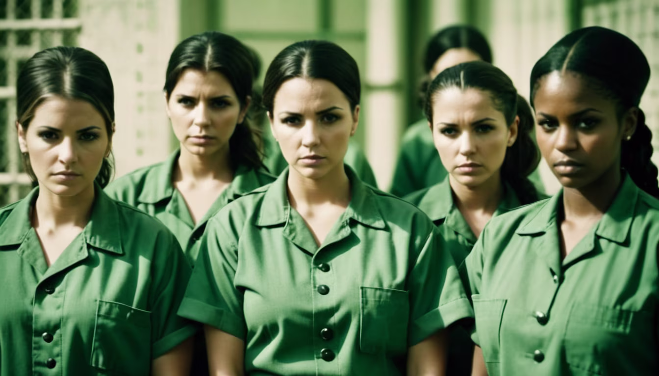 Prompt: group of female prisoners, prison gang, green jail uniform, revealing, standing together, attitude look