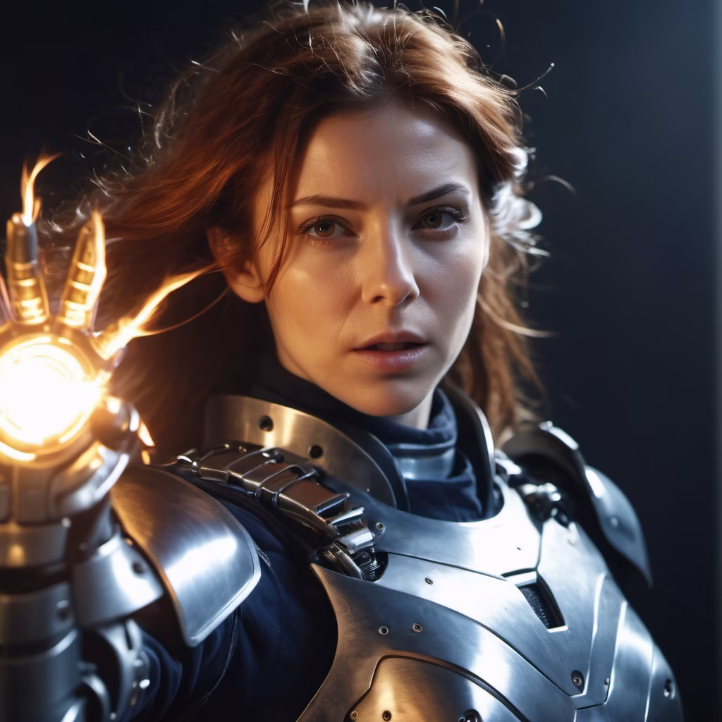 Prompt: cinematic slow motion shot of a woman in mechanical armour in body. she has dense hair. she is igniting an anti matter in her hand which is glowing and emitting shock and electricity and distorting reality. they image is 8k resolution photo