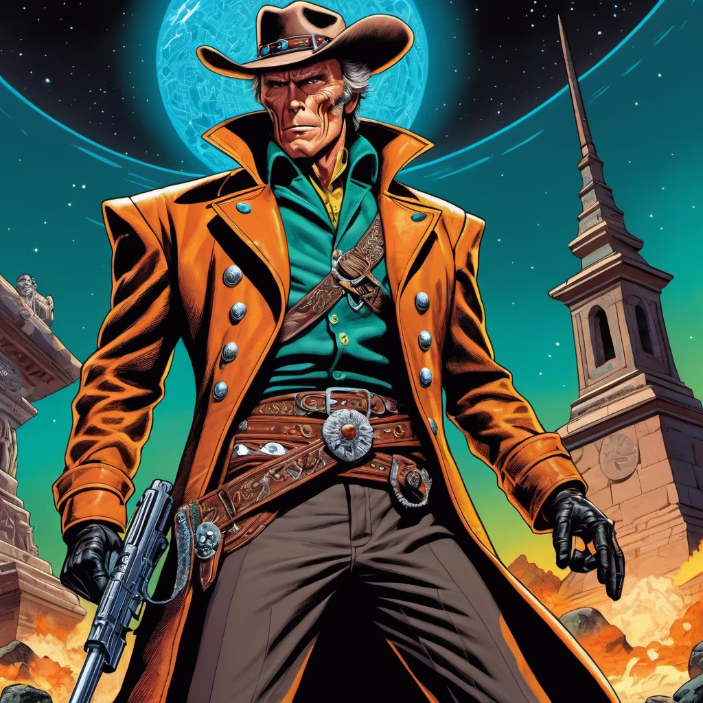 Prompt: 2d cartoon characters, caricatured form, full body head and legs, supervillain space android cowboy Capricorn Kid (Clint Eastwood), holding a revolver in his hand, brutal, shining, flashes, splashes, light rays, halo, glow, against the background of a detailed complex dark evil Western City Tombstone, rage, anger, aggression, ready to take on any opponent with his strength and supernatural abilities, strength, power, cartoon scenes, sci-fi, fantasy, action pose, dnd character, DC Comics style, 70s TV series, vibrant color, high detailed background, high detail, best quality, cartoon, by Jack Kirby, Alex Ross, Giger, Frank Mille, Boris Vallejo