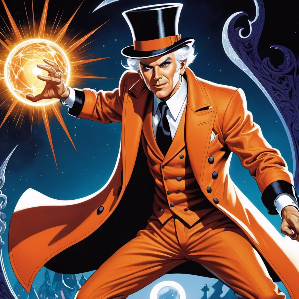 Prompt: 2d cartoon characters, caricatured form, full body head and legs, supervillain Mister Mxyzptlk (Charles Chaplin), dark-orange suit, bowler hat, flashes, splashes, lightning, halo, glow, glowing energy sphere, against the background of a detailed complex dark in the fifth dimension, rage, anger, aggression, ready to take on any opponent with his strength and supernatural abilities, strength, power, cartoon scenes, sci-fi, fantasy, dynamic attack pose, dnd character, DC Comics style, 70s TV series, vibrant color, high detailed background, high detail, best quality, cartoon, illustration by Jack Kirby, Alex Ross, Giger, Frank Mille, Boris Vallejo
