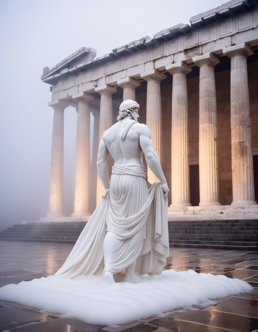 Prompt: This is the back of a full-length white Greek sculpture, wrapped in a white plastic with fog in the air and a lot of bath foam on the ground. In the background is the interior of a restored ancient Greek temple hall. Greek sculpture, male, full body, white plastic, Ancient Greek, temple, night scene, foam.