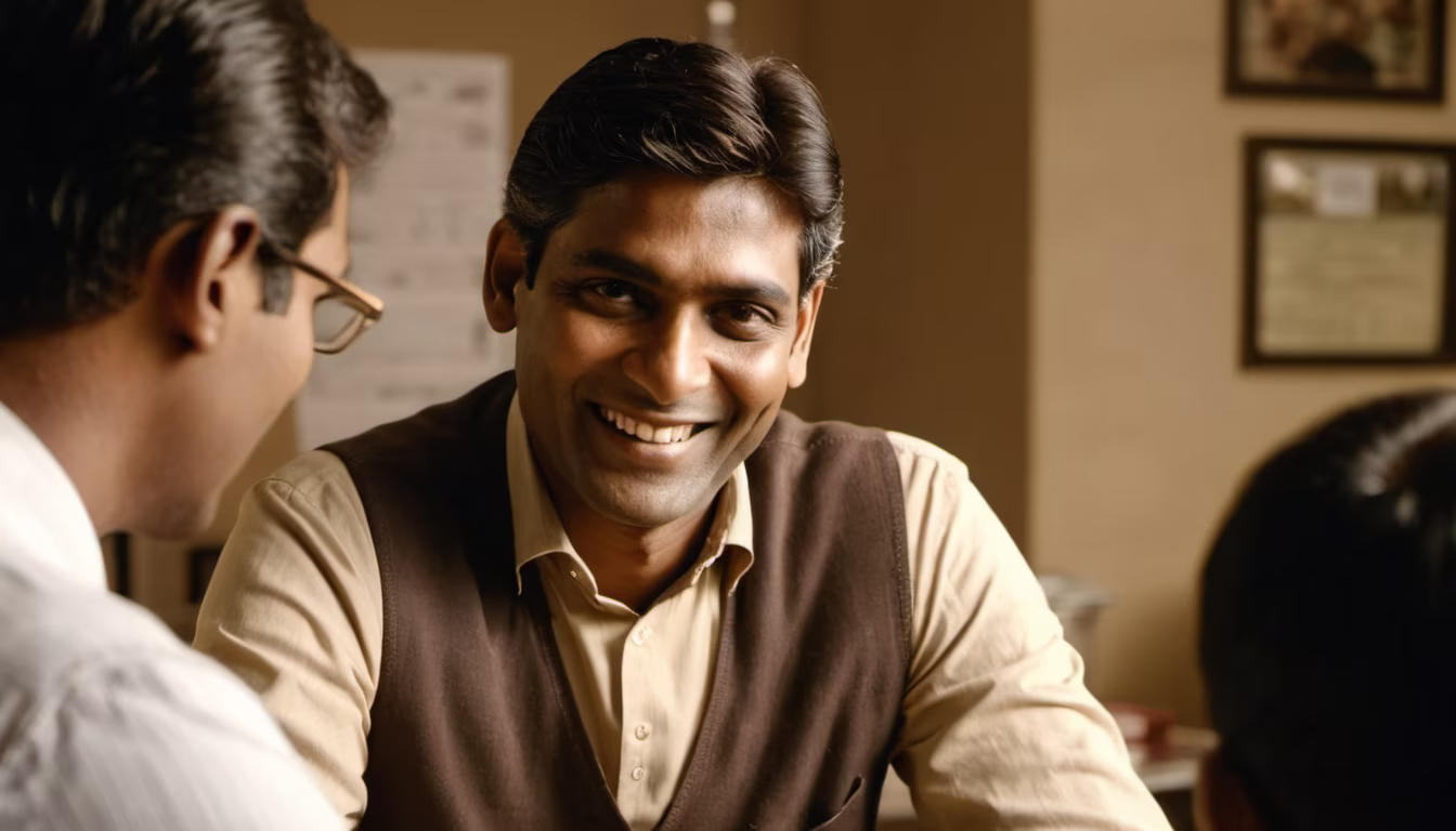 Prompt: young chubby indian man working in a office as an entrepreneure, meeting with people