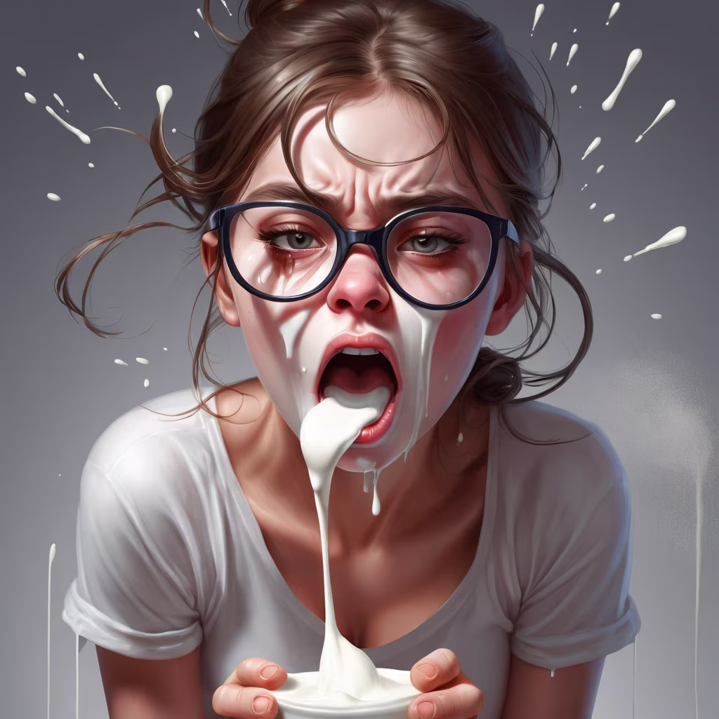 Prompt: the girl is on her knees, angry, drops of milk are spreading on her face, white cream on her nose, glasses and lips, lips are slightly open