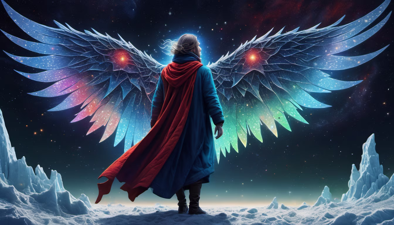 Prompt: ((((extremely detailed quantum Luminescent psychedelic complex)))) dark blue red green (((huge giant massive ultimate powerful being with frost wings full of dark energy in stellar space of interdimensional universe))) ((sparkling stars covered night)) (iced ocean, cold night)
