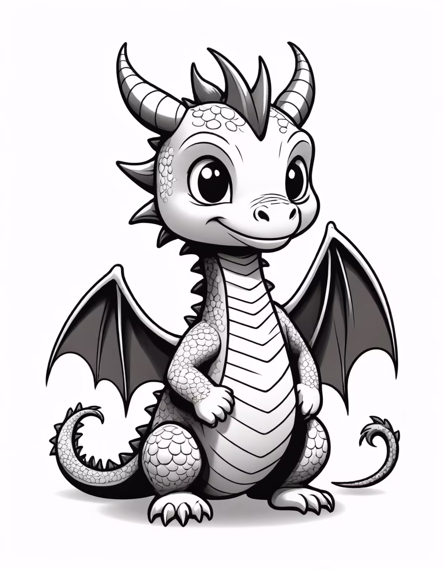 Prompt: simple cute dragon children’s coloring book vector cartoon black and white only dark outlines scene is in space