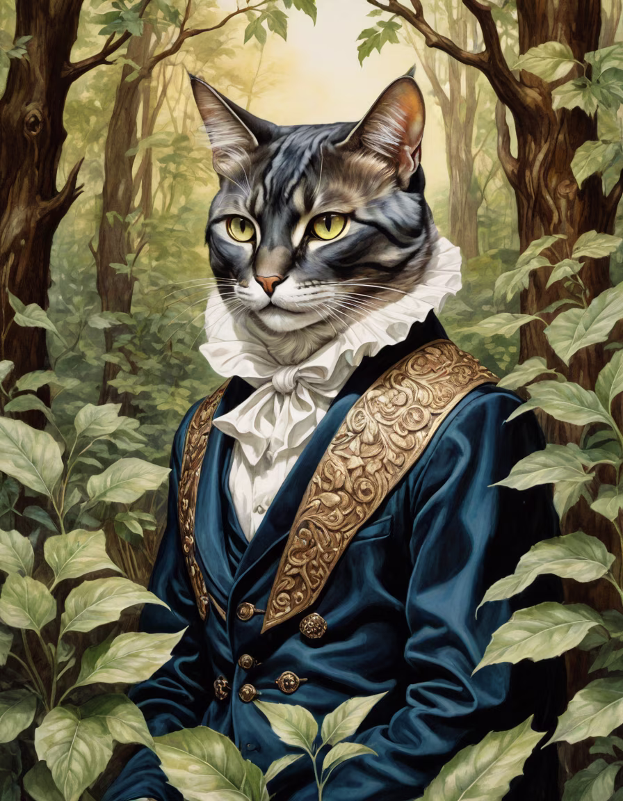 Prompt: painting, dark fantasy, anthropomorphic cat with three eyes, from another world, forest from another planet with unknown vegetation, colorful vegetation, stunning painting art, by Caitlin Hackett, super details, different poses, George Frederic Watts, ledmund leighton, by Alexandre Cabanel, herbert james draper, inspired by George Frederic Watts, by Herbert James Gunn, by Frederic Leighton, hypnos, frank dicksee