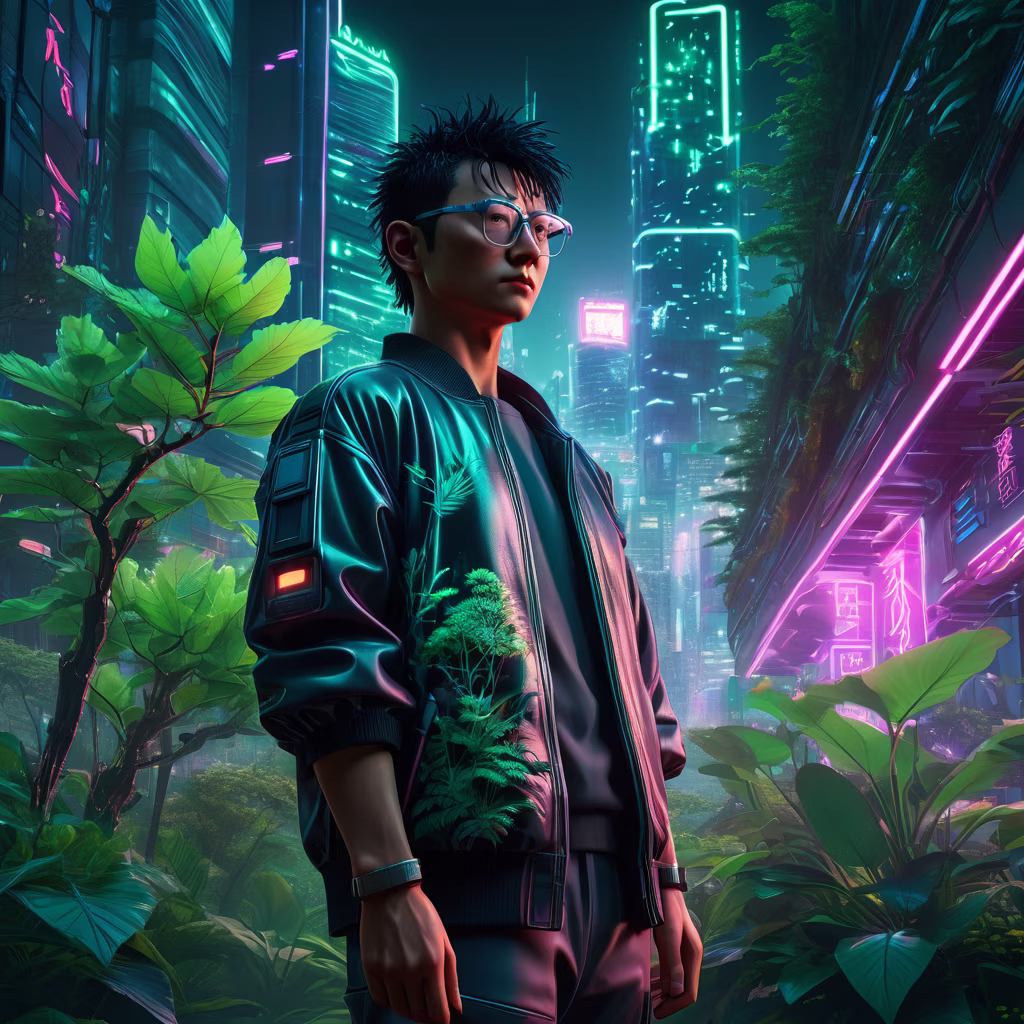 Prompt: A botanical portrait of Akira, surrounded by lush trees and flora, standing in a futuristic neon-lit cityscape, hyper realistic botany fused with retro cyberpunk, cel-shaded anime style, Akira Kurosawa lighting, Alexey Egorov textures, 8K resolution, highest quality, trending on ArtStation.