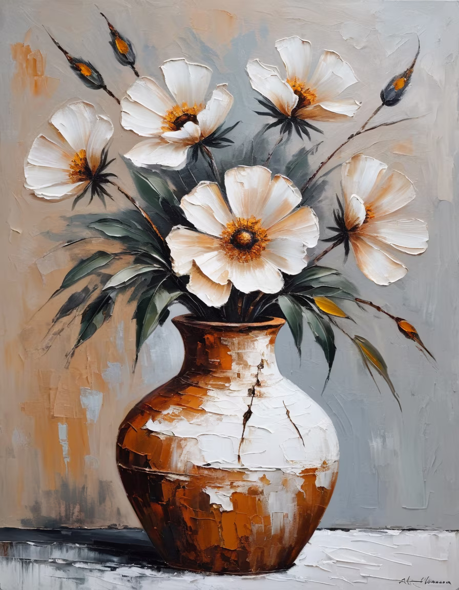 Prompt: Palette knife painting, abstract oil Painting of a rose vase in an white canvas texture background. Bold brush strokes. Ad copy. Huge copy space. Modern art. Painting by Aziz Sulaymanov kyrgyzstan Artist. Painting by Marco Ortolan. | Masterpiece , minimalismo