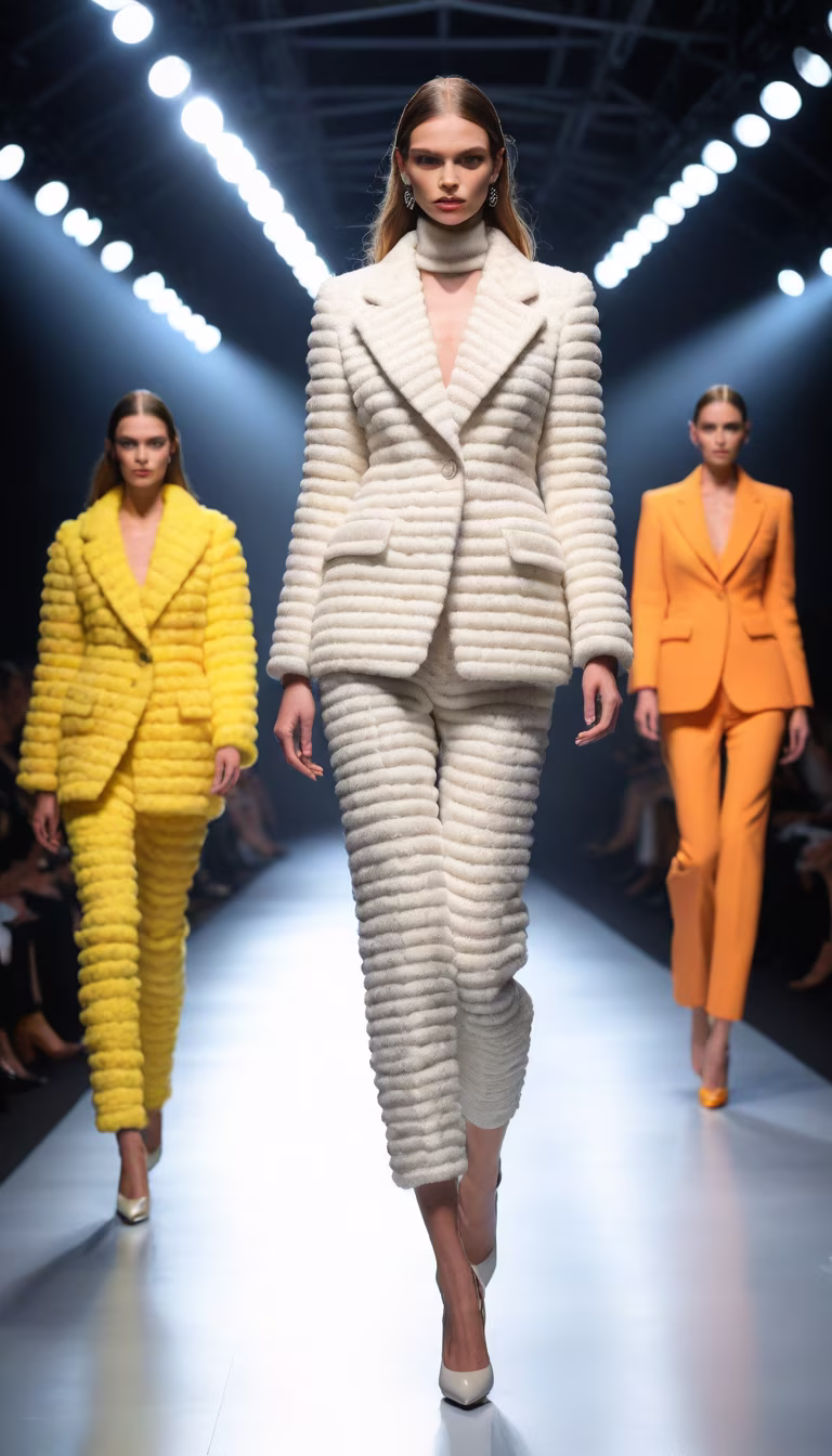 Prompt: fashion show, stunning outfits, haute couture: models in very puffy Hypersize disproportionate suits in coarse knit, high heels, the smallest details and catwalk details, bright spotlights, Volumetric and dynamic lighting. Hyperrealistic photorealistic hyperdetailed maximalist masterpiece