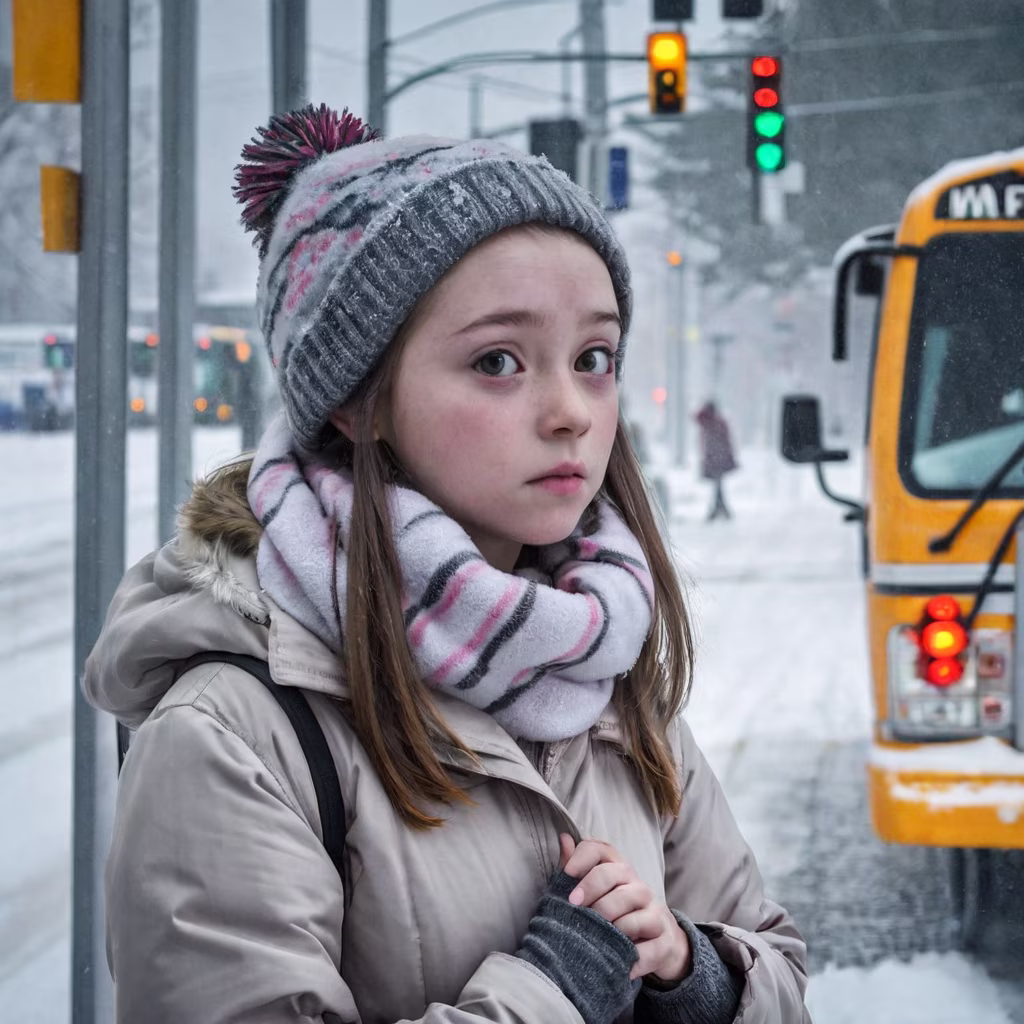 Prompt: A young girl, amidst the snowy scenery of Snow Village, gazes at the snowflakes falling from the sky.