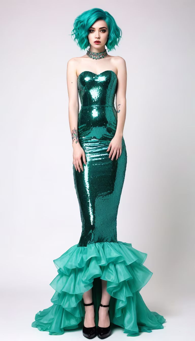 Prompt: 5 foot, 5', 120lbs, petite, short, thick emo woman with thick arms, wide thick waist, wide thick legs, thick hips, wearing a shiny mermaid prom dress with frills at the bottom, with short multicolored green blue hair, pale skin, delicate skin, blank skin, feet, shoes, white background, blank white backdrop, 8k, HD, high definition