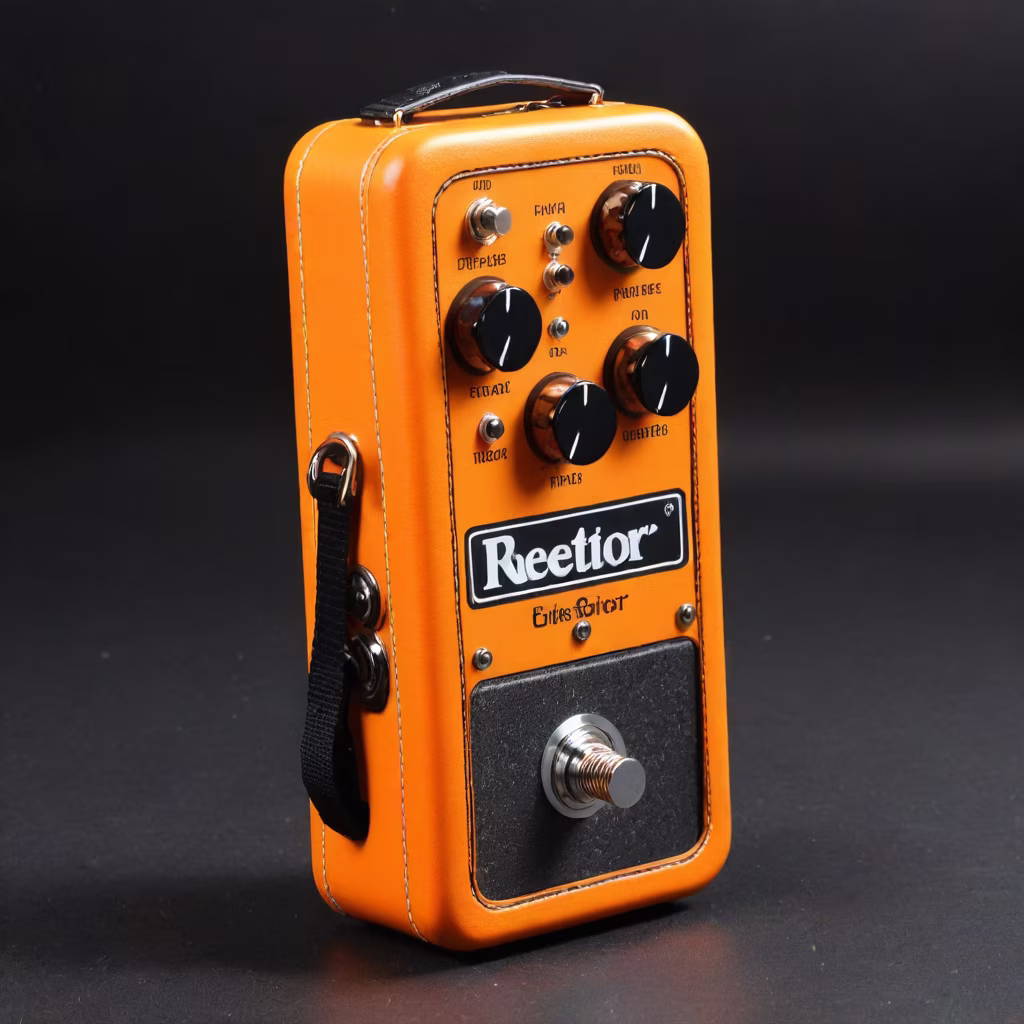 Prompt: Guitar effector mini zipper storage bag, with an orange metal shell inside the effector, in an open state