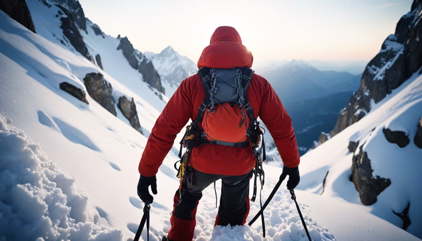 Prompt: mountaineer in red jacket, climbing steep mountains, hanging with harness, ropes, heacy snow