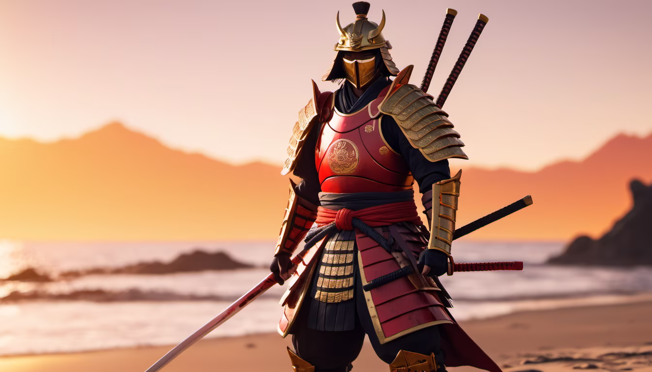 Prompt: A samurai warrior, red armor, battle damaged, on the beach during sunset, a 3D render, unreal engine, Cinematic lighting, golden hour, warm tones, reds orange, yellow