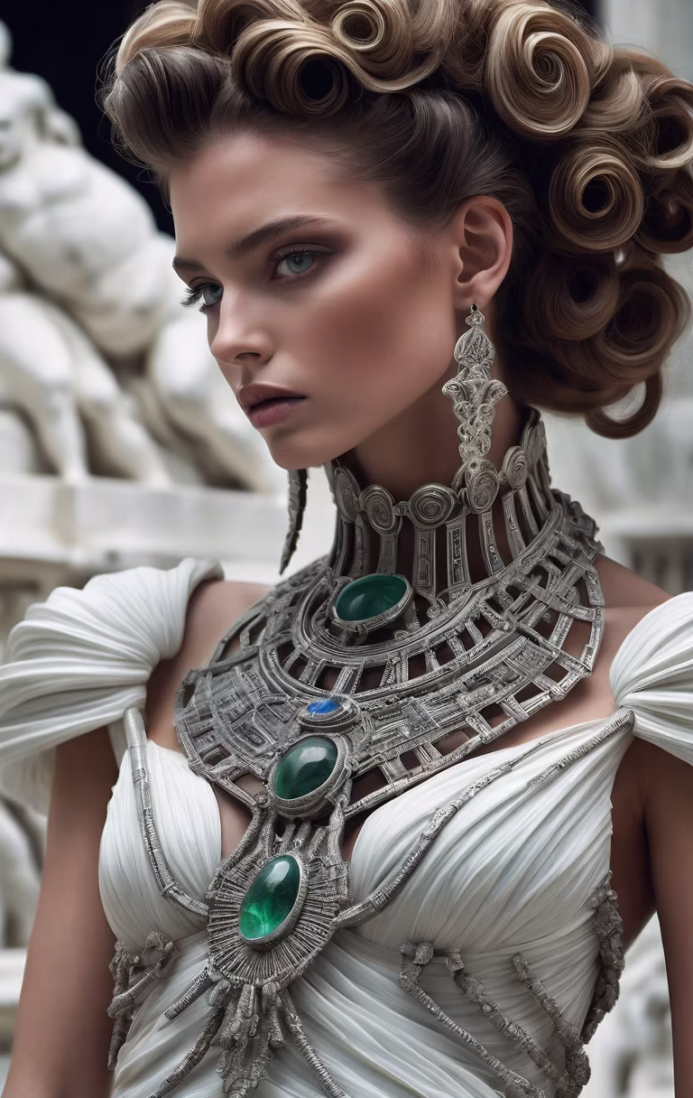 Prompt: Gorgeous model, zoom on her neck with intricate ancient greek gemstone jewelry. Long updo Hairtyle, Very highly voluminous, very lofty, richly detailed, intricately textured. The white Delphos gown. Giger. Alexander McQueen