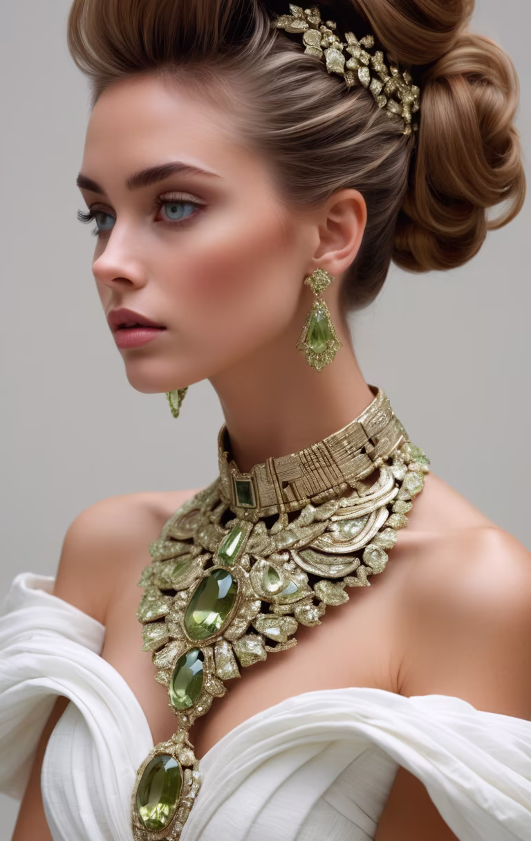 Prompt: gorgeous model, intricate royal chrysolite necklace, Long updo Hairtyle , Very highly voluminous, very lofty, richly detailed, intricately textured. Aztec, Andrew Loomis, white elegant shirt Caroline Herrera.