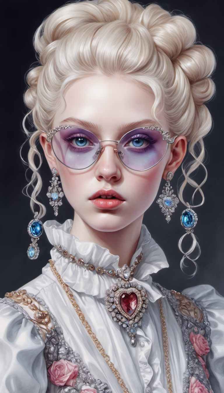 Prompt: gorgeous model, intricate gemstone jewelry, Long updo Hairtyle , Very highly voluminous, very lofty, richly detailed, intricately textured. tumblr, rococo, cool glasses, “diamonds, 🎀 🧟 🍓 🧚, in style of chrome hearts, intense albino, clear eyes. 2 4 mm, heart eyes, couture, super realistic”, intense eyes