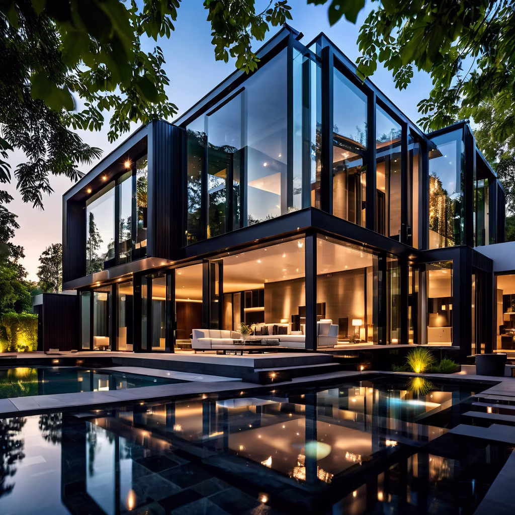 Prompt: Contemporary house with large pool in front. modernism, glass, stone, symetric, luxury, large garden with large glass
