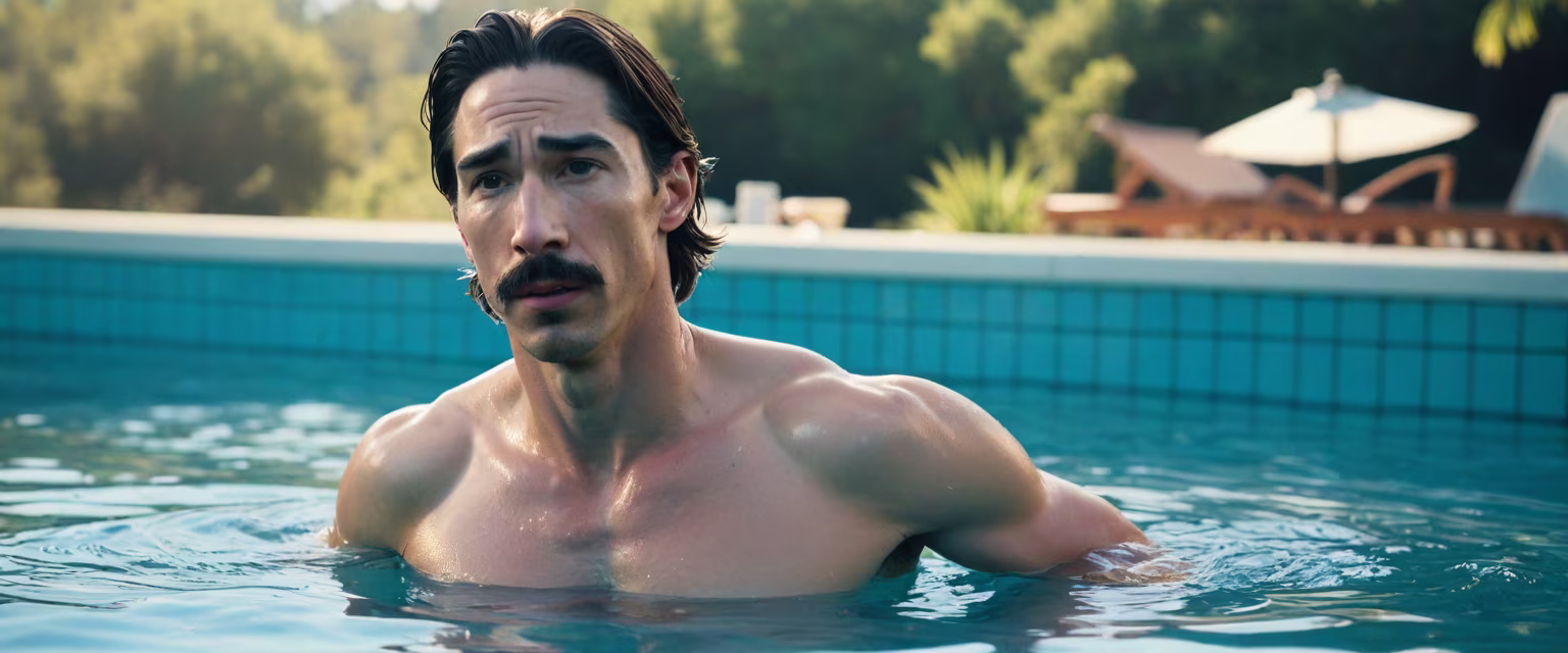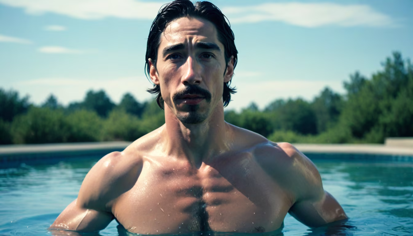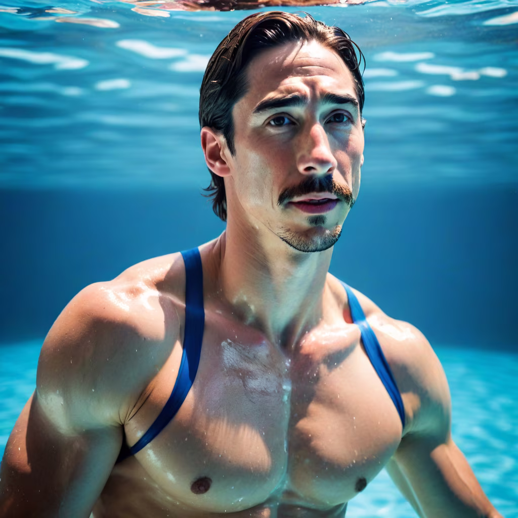 Prompt: the muscular and sweating handsome youfull adultmale with goatee and side burns and musctache chest and belly hair as well as muscular physically fir lean toned body of the 1990s actor justin long turning into a horse while diving under clear water in a speedo and jockstrap made from translucent blue celophane