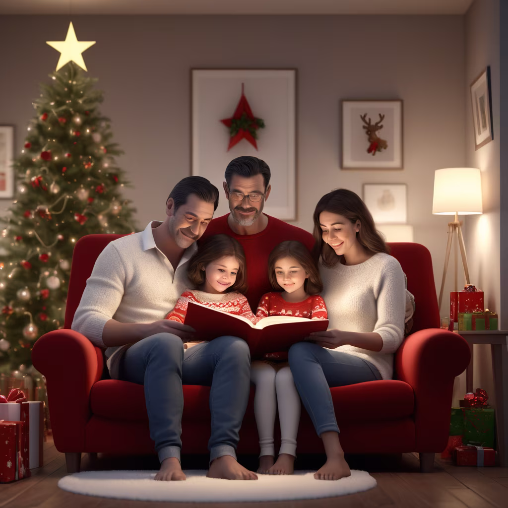 Prompt: Familia colombiana conformada por padre, madre y dos hijos pequeños, en ambiente navideño y hogareño, leyendo felices en una sala minimalista decorada con navidad. con estilo de animación Pixar 3d