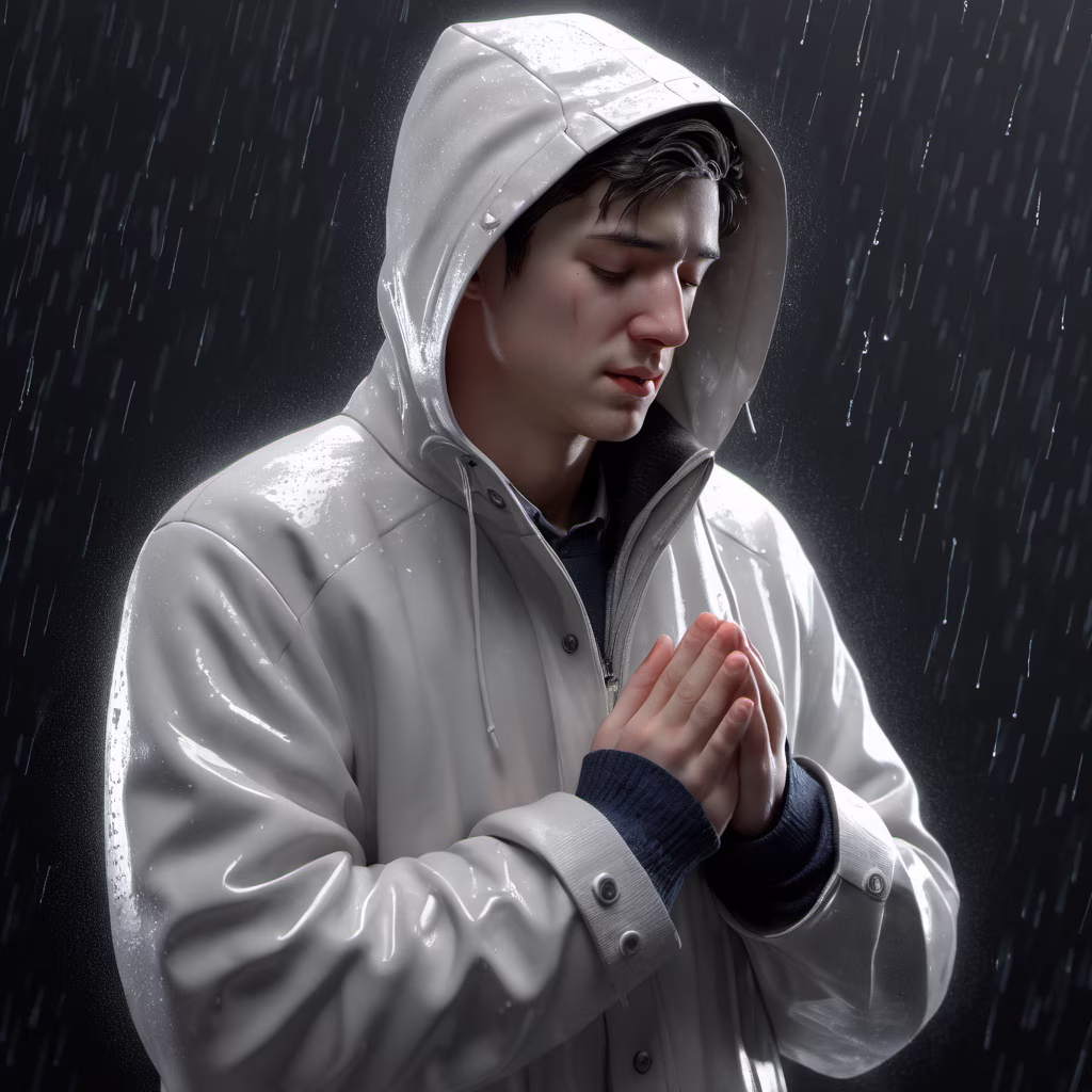 Prompt: 20 year old man image from head to waist, white, eyes closed, is wearing a cold coat with a hood, head down, with his hand on his heart, feeling pain, with rain falling, highlight the rain in 3d, in the middle of the night, highly detailed, head-to-toe image, hyperrealistic.