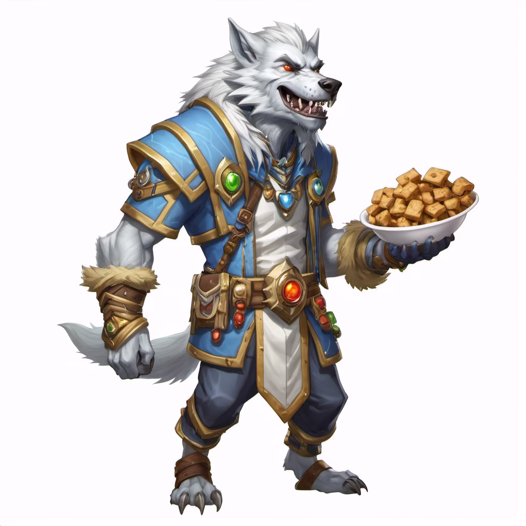Prompt: hearthstone, world of warcraft, white worgen holding a snack, white background