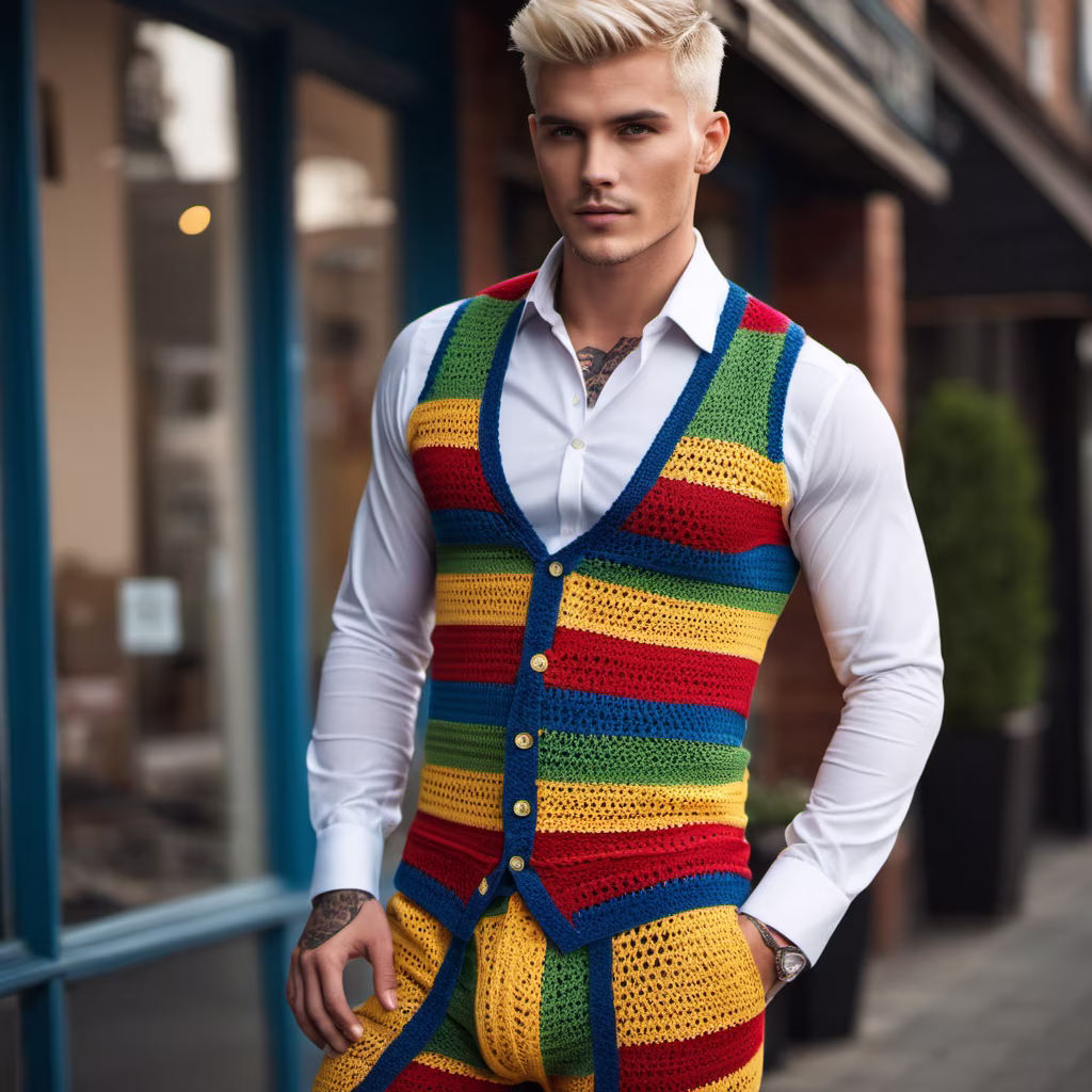 Prompt: I won’t say a word about men’s outfits He who is nice is always pleasant and dressed up the man is dressed in yarn crocheted lingerie (three views, front, side, back) colorful tattoo (Full height) mramor 8k real pro+ Blondie men