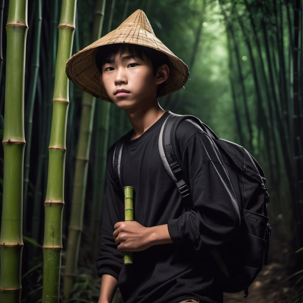 Prompt: A young Asian teenager, clad in a black long-sleeved shirt and carrying a black backpack, wearing a pointed bamboo hat, lies exhaustedly in a bamboo forest during the night
